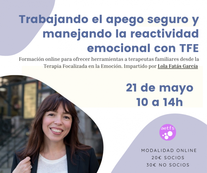 Ponente: Lola Fatás García, psicóloga sanitaria, Terapeuta familiar, docente y supervisora acreditada por FEATF y FEAP. Supervisora TFE y terapeuta certificada por ICEEFT. Directora del Gabinete de Terapia de Pareja de Zaragoza y profesora colaboradora del Máster de Intervención Sistémica de la UZ. Directora de TFE España y coordinadora en España de la formación oficial de ICEEFT, el Centro Internacional para la Excelencia en Terapia Focalizada en las Emociones