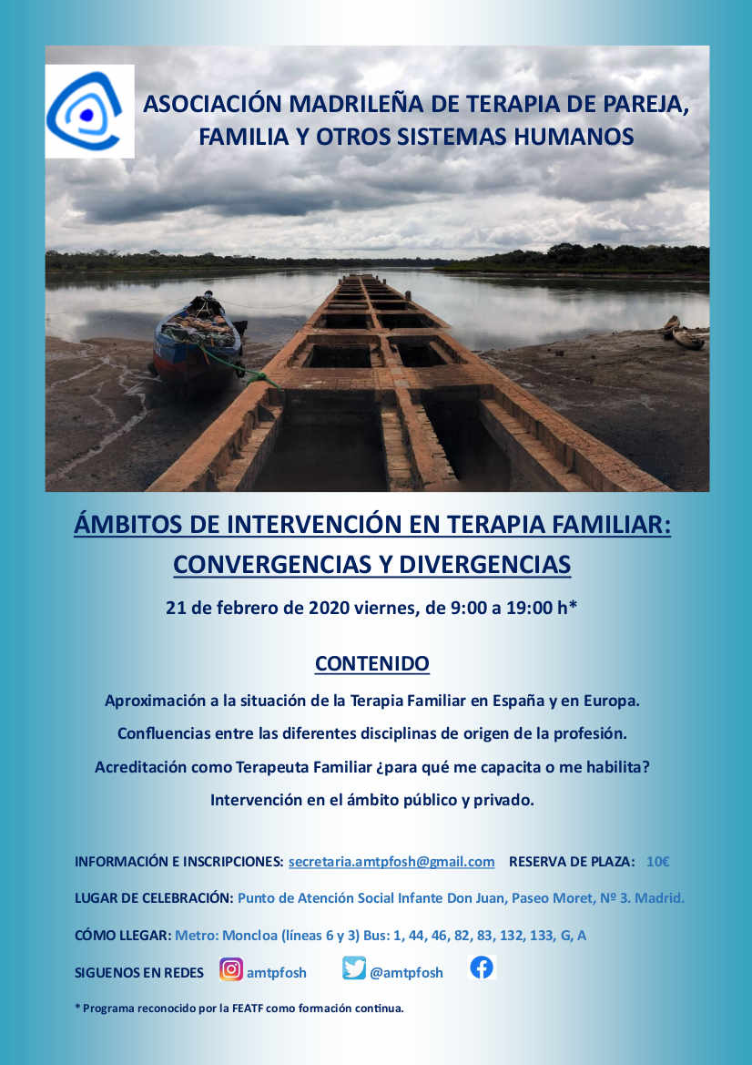 La Asociación Madrileña de Terapia de Pareja, Familia y Otros Sistemas Humanos organiza la Jornada «Ámbitos de intervención en Terapia Familiar: Convergencias y Divergencias«, el próximo 21 de febrero.