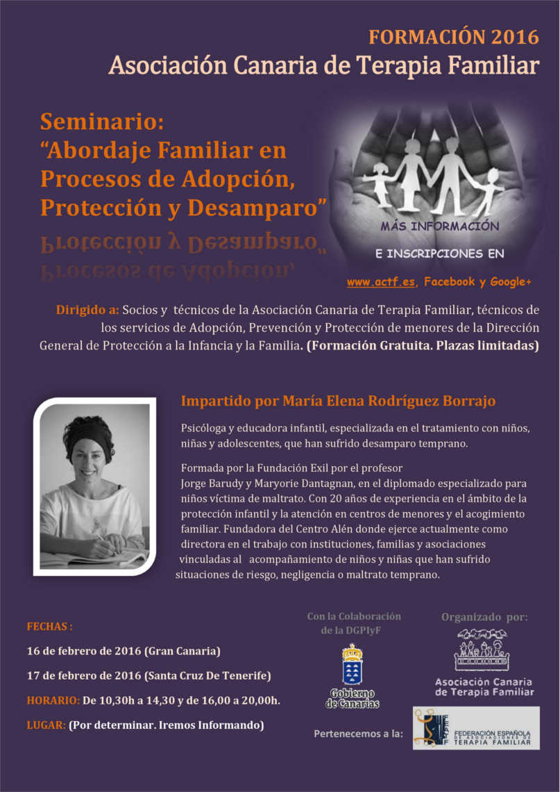 Hace unos meses la Asociación Canaria de Terapia Familiar firmó un convenio de colaboración con la Dirección General de Protección a la Infancia y Familia del Gobierno de Canarias, y mediante el cual vienen desarrollando 2 proyectos de trabajo en torno a la adopción, este primer trimestre del 2016 se impartirá un seminario sobre profundización en el abordaje familiar en familias adoptivas.