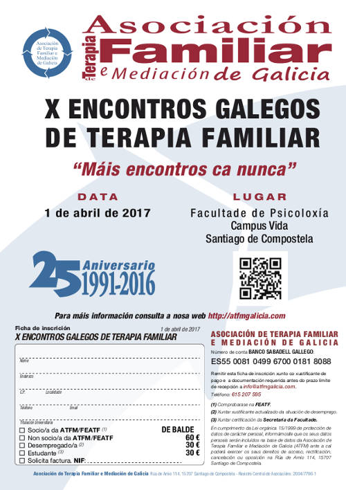 El sábado 1 de abril la Asociación de Terapia Familiar e Mediación de Galicia celebra sus X Encontros Galegos de Terapia Familiar. Esta edición es especial pues la Asociación Gallega celebra sus veinticinco años de historia, por lo que han incluido en su programa una comida conmemorativa y un homenaje a sus anteriores presidentes. Además, aprovecharán para elegir en asamblea la nueva Junta Directiva que estará al frente de la Asociación.